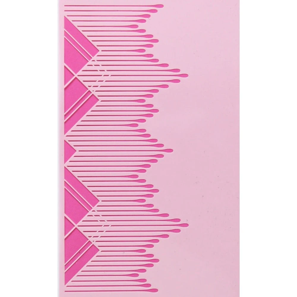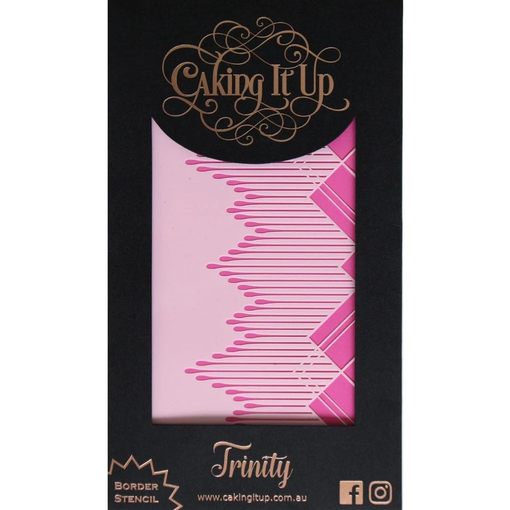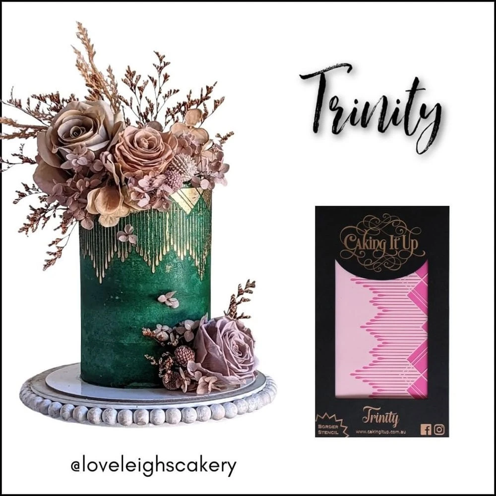 Our Trinity border cake stencil creates a beautiful chandelier like effect. Can be used to create a hanging effect along the top edge of your cake or a climbing effect along the bottom edge of your cake. It will be sure to add a beautiful texture to your cake design.