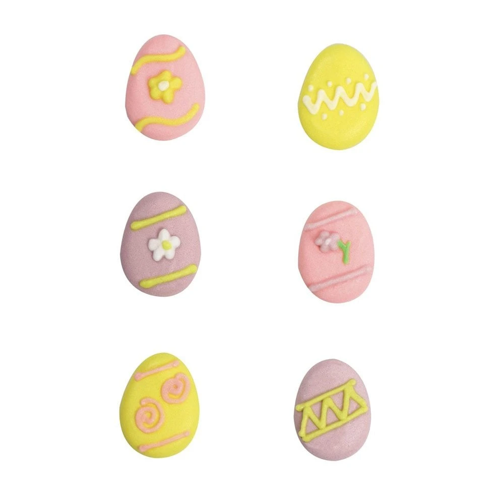 These delightful assorted Easter Egg Sugar Pipings are edible cake decorations, which are individually hand piped using royal icing. They make great cupcake decorations, or they can be combined in a pattern to decorate a full-sized cake.