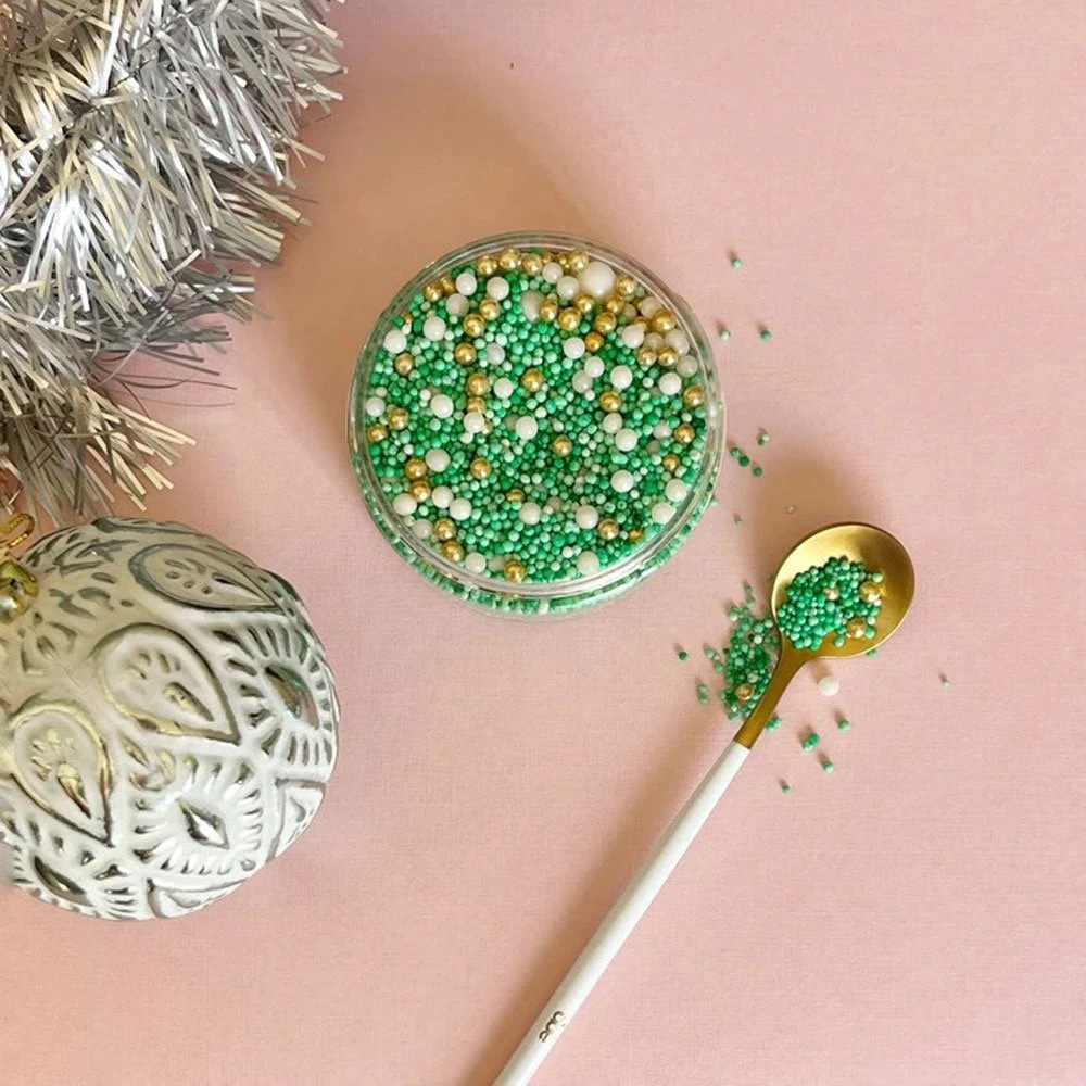 Let it Snow is a joyful blend of refreshing green studded with pearly white and vintage gold pearls.