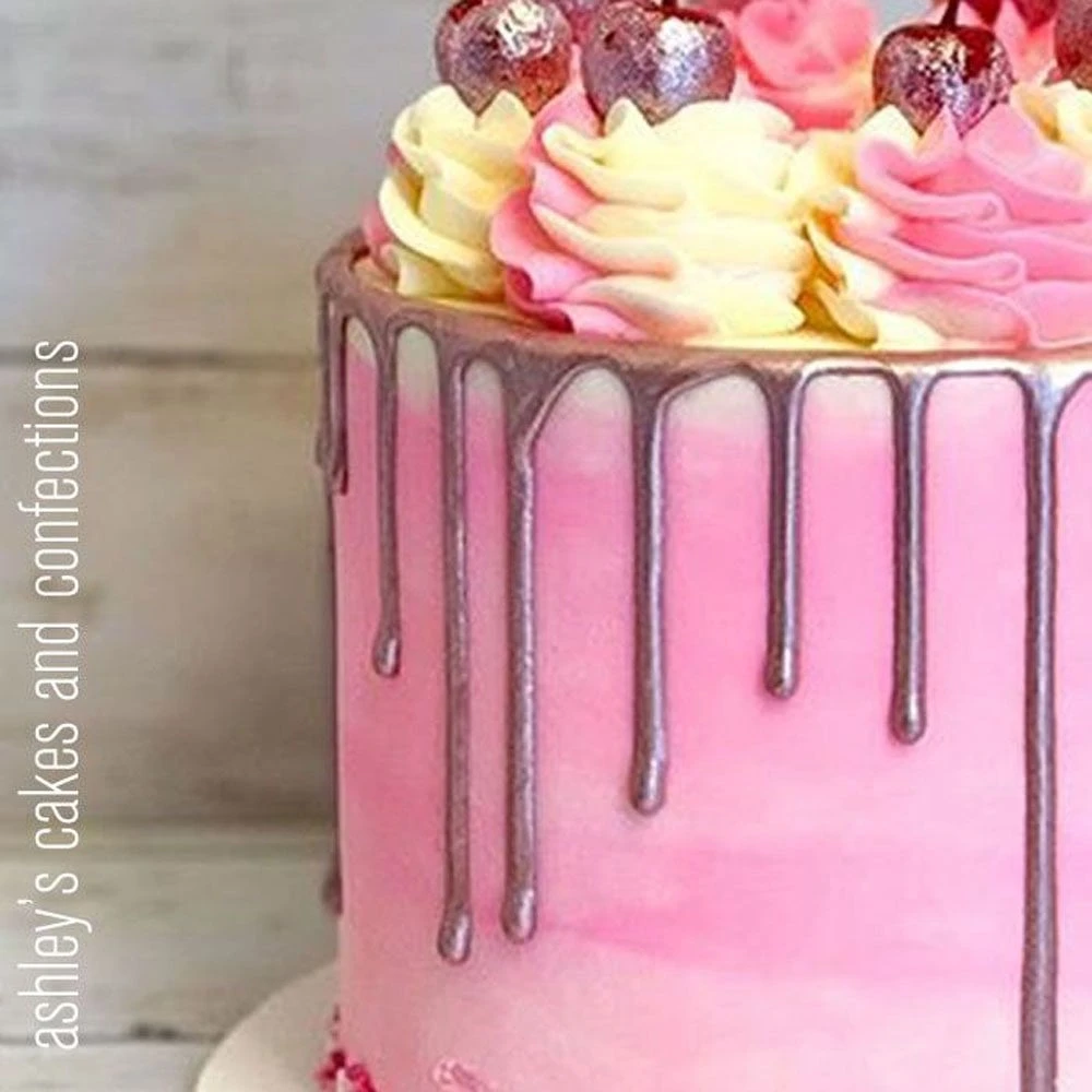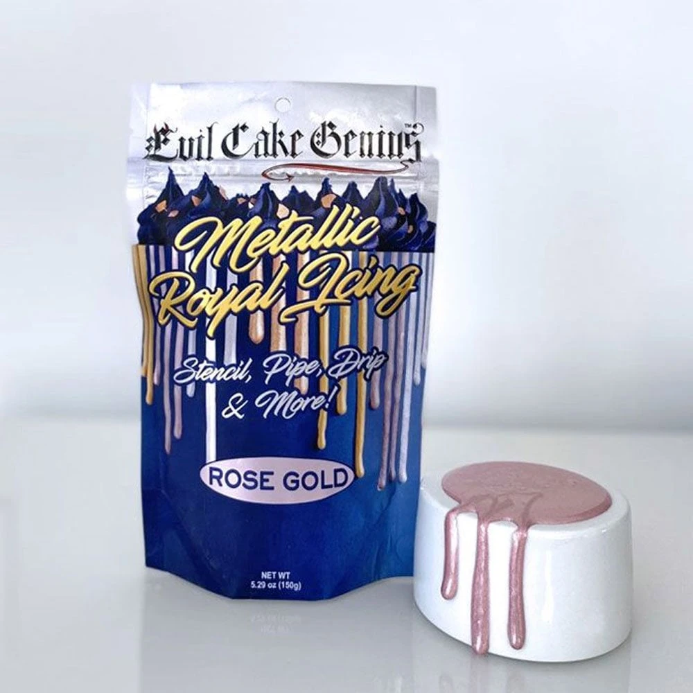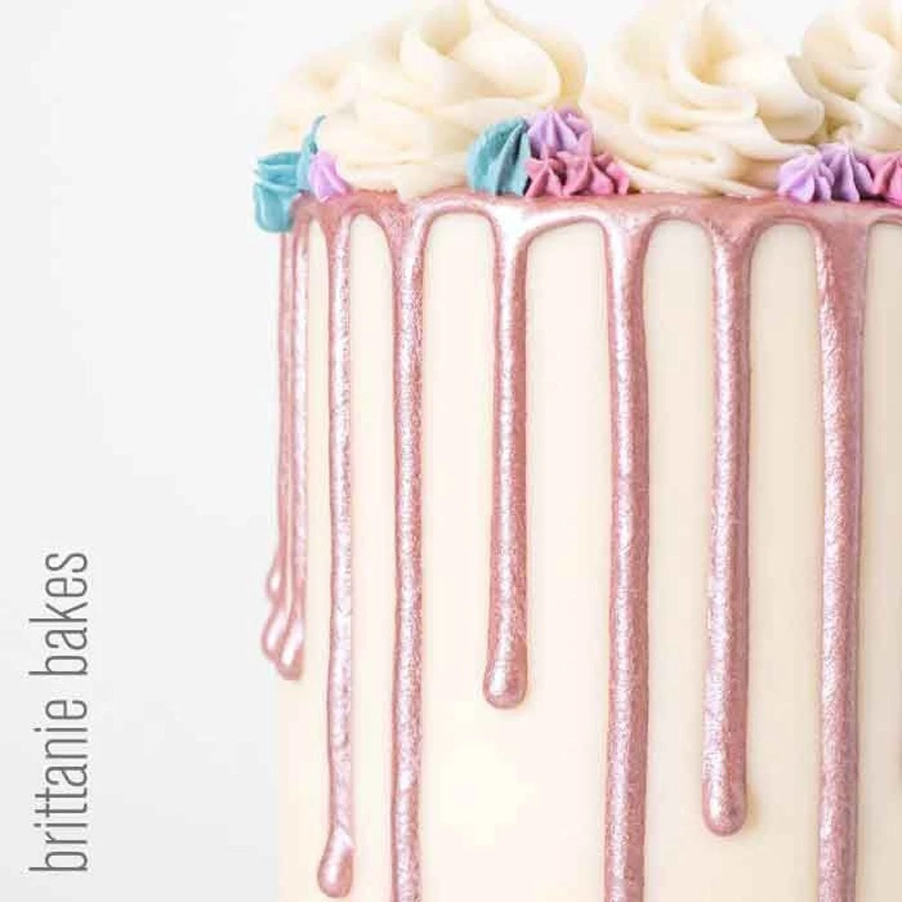 No need to paint or airbrush for beautiful rose gold details on cakes! Shimmery Rose Gold Icing for Stenciling, Mesh Stenciling, Metallic Drip, and Piping! Just add Water and use! Shown used it as metallic gold Cake Drip!! Our Rose Gold Royal Icing dries hard, and is completely edible! Sheer Genius!