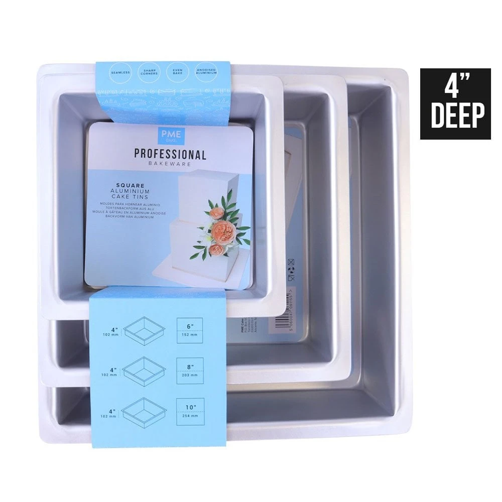 PME 4″ Deep Square Cake Tins – Set Of 3 – 6″, 8″, & 10″