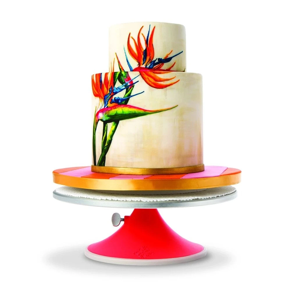 An easy-to-turn tension key on the base controls the turntable’s spinning speed; tighten the key completely to lock the rotating platform in place. The one-piece, wide base design creates a stable platform for flawless icing, sculpting, decorating, piping, and flower arranging.