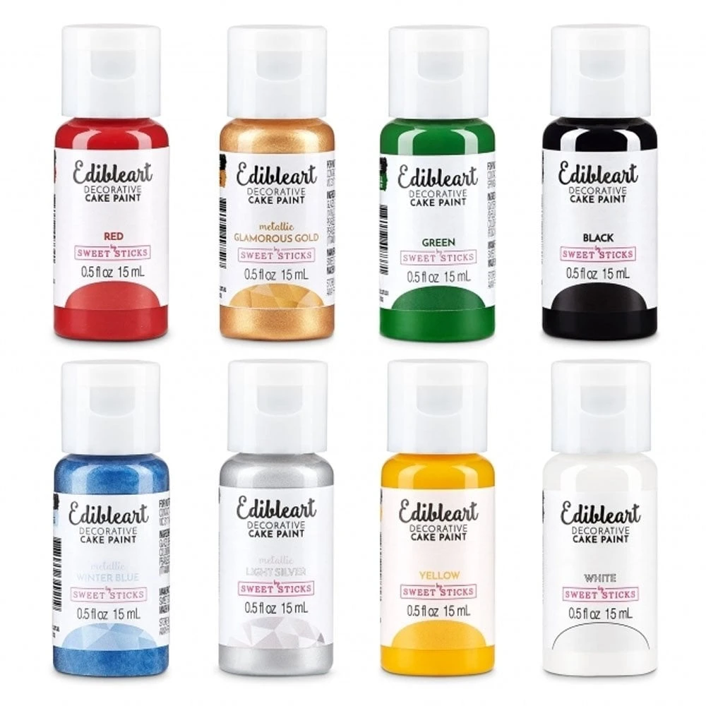 These revolutionary metallic art paints by Sweet Sticks are the first of their kind, designed to enhance the finer details in cake and cookie decorating. These paints take away the need to mix lustre and alcohol together that makes one big mess most of the time – and costs more money! With edible art paint, simply shake, pour and paint!