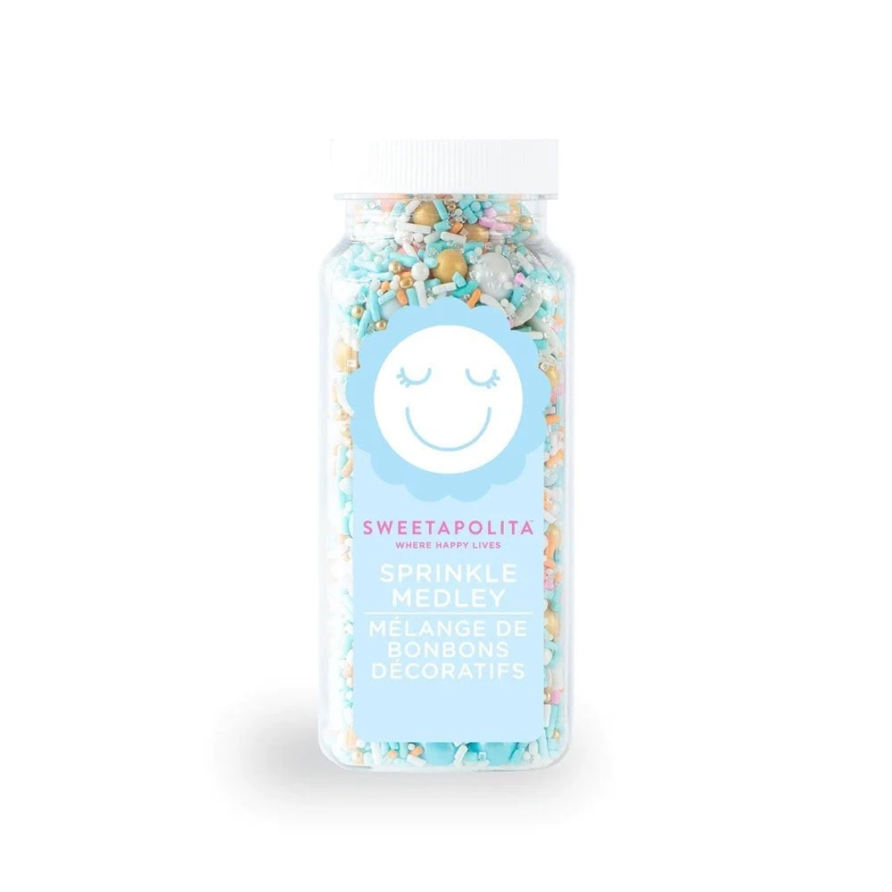 SAND + SKY Sprinkle Medley is a premium, one of a kind mix of some of the most beautiful beachside-inspired sprinkles in the universe: pastel shades of ocean-blue and white sprinkles, shimmery sea-shell confetti, gorgeous jumbo matte and polished sugar shapes, tiny white pearls, candy beads, coral/white/shimmer blue candy-covered chocolate balls, tiny gold dragées, tons of sparkly sugar, edible glitter and more.