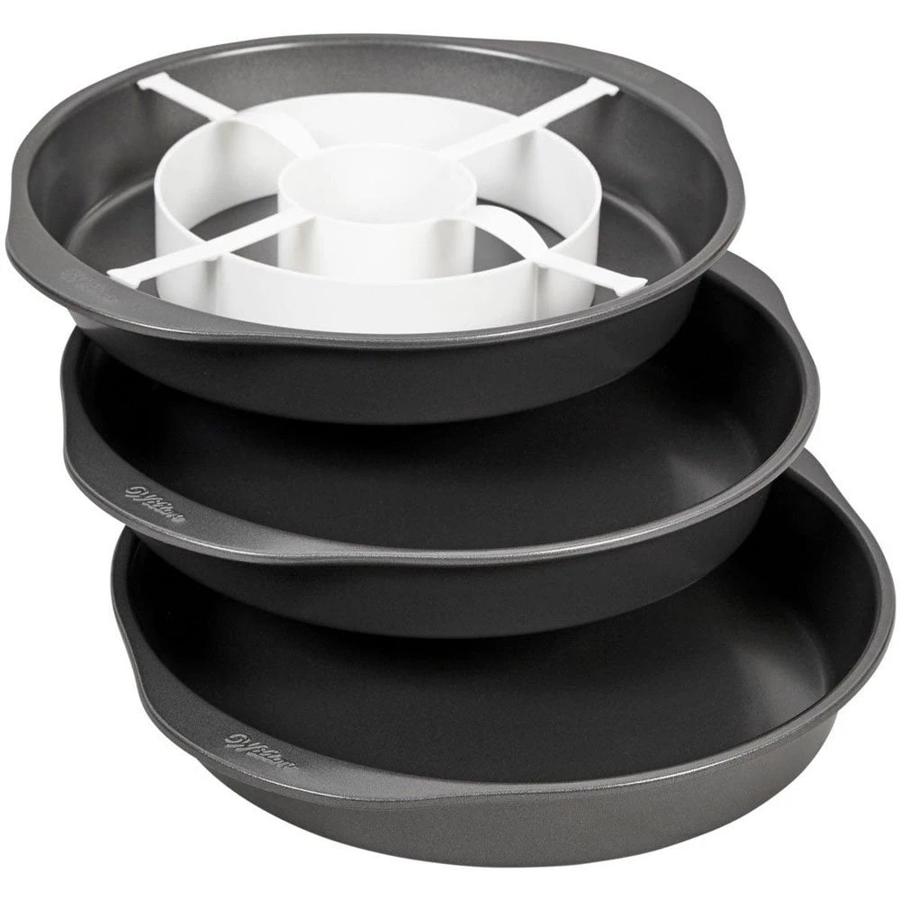 This unique baking pan set, will make every piece of cake look like a multi-coloured piece of art. It‘s simple and it works. The separator ring divides the cake batter into different sections of the baking pan easily. Using all 3 pans you could create 3 layers.