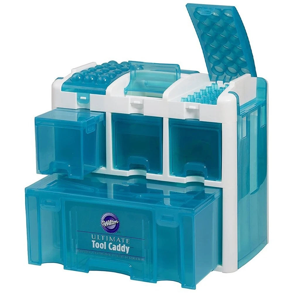 You’ve got all your cake decorating supplies, now how do you keep them organised? Than this Wilton Ultimate Tool Caddy is perfect for you! The tool caddy is suitable for storing decorating tips, flower nails, fondant tools, cutters and much more. The specialized compartments, customisable spaces and amazing extras make storage or you cake decorating tools and accessories easy and efficient. The caddy features three levels of organization: Top Level: tip and accessory organizer compartments. Middle Level: flip-top drawers and icing color drawers. Bottom Level: oversized drawer for oversized items. Plus spatula slots to hold your spatulas.